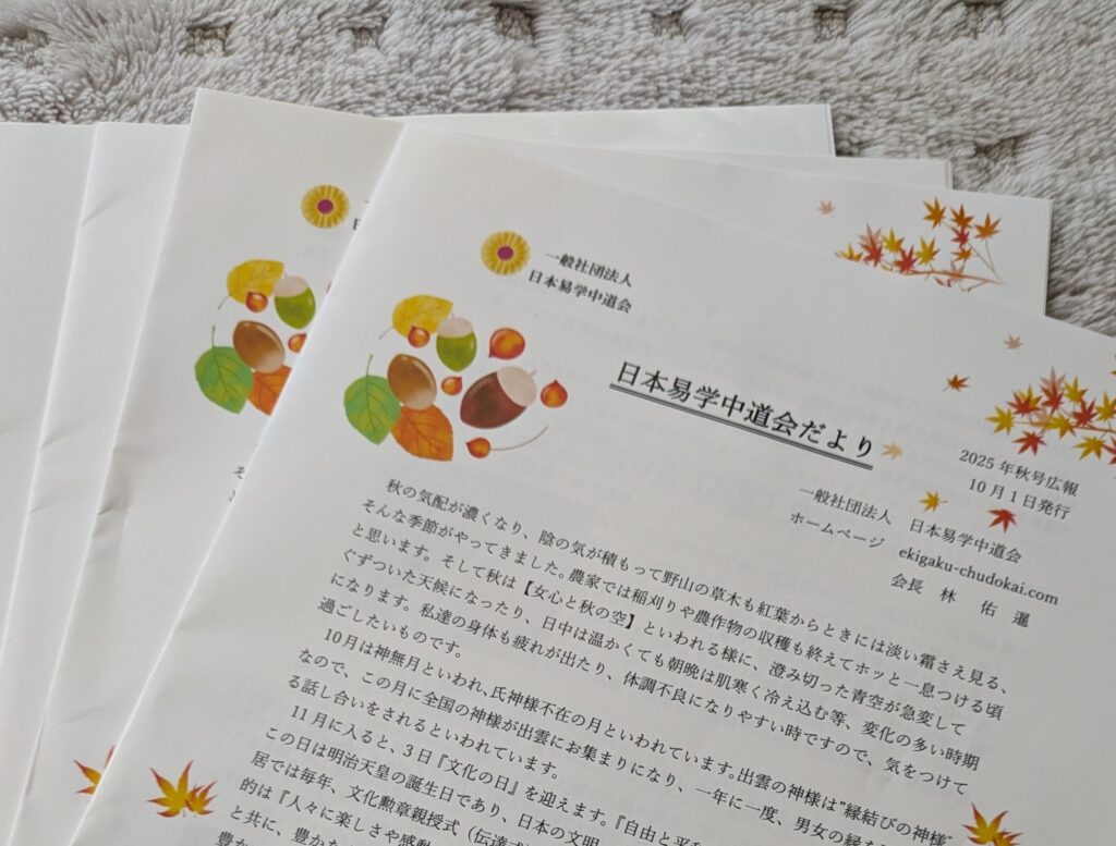 秋の広報が完成しました。主な内容は、7月研修の詳細・経験に基づいた陰陽五行・手相基礎知識となっています。